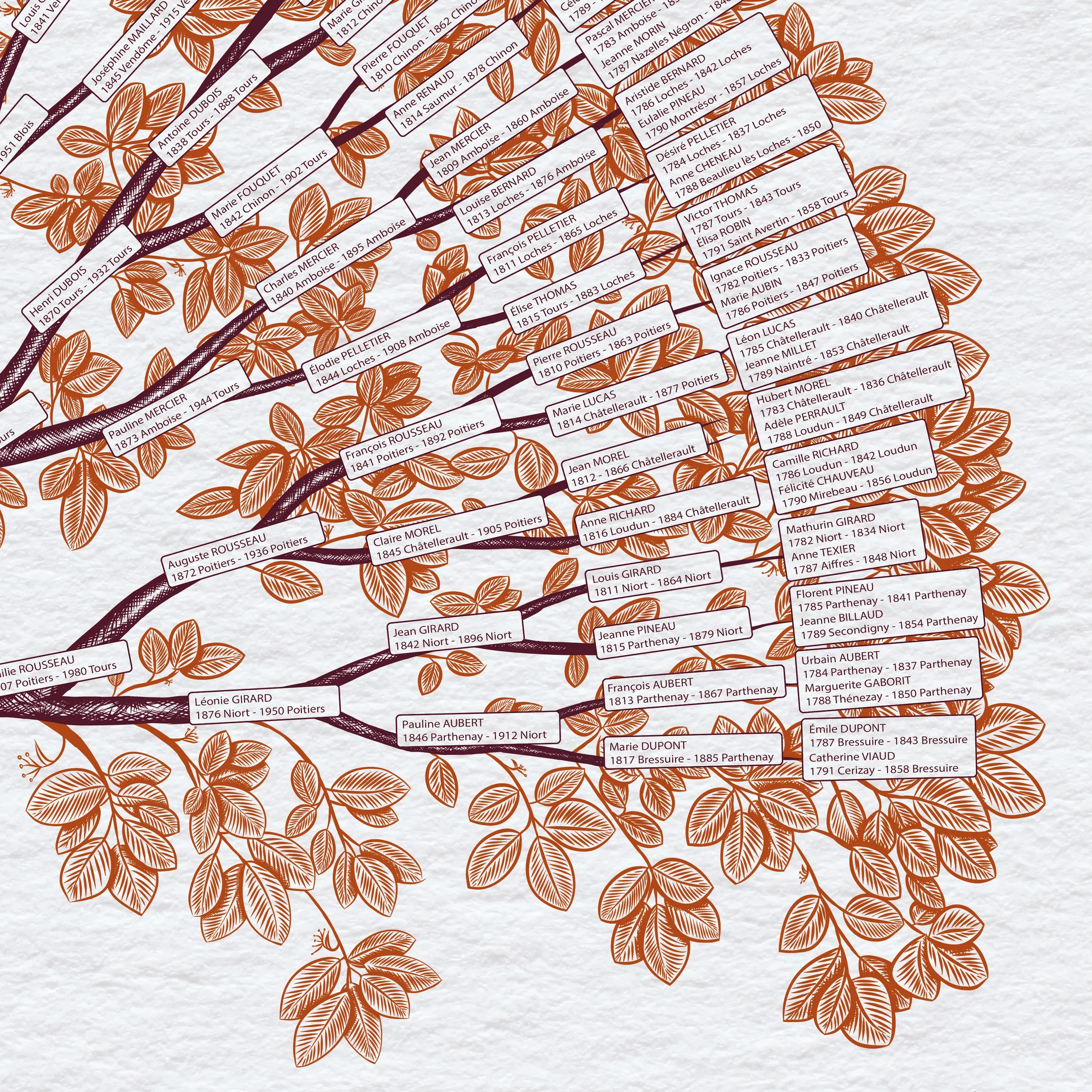 Recherches généalogiques dans les archives civiles et paroissiales. Pour chaque individu établi : prénom, nom, dates et lieux de naissance et de décès. Illustration réalisée sur mesure selon votre arborescence réelle. Impression haute résolution 300 dpi sur papier texturé. Livraison en tube de protection.