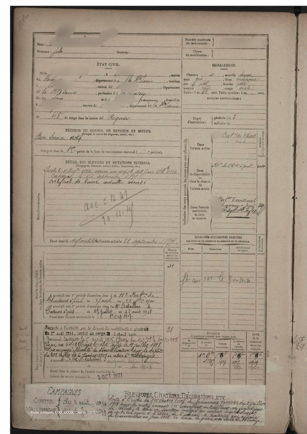 Retracez les parcours vécus de certains ancêtres : mobilisations, affectations, campagnes, décorations.