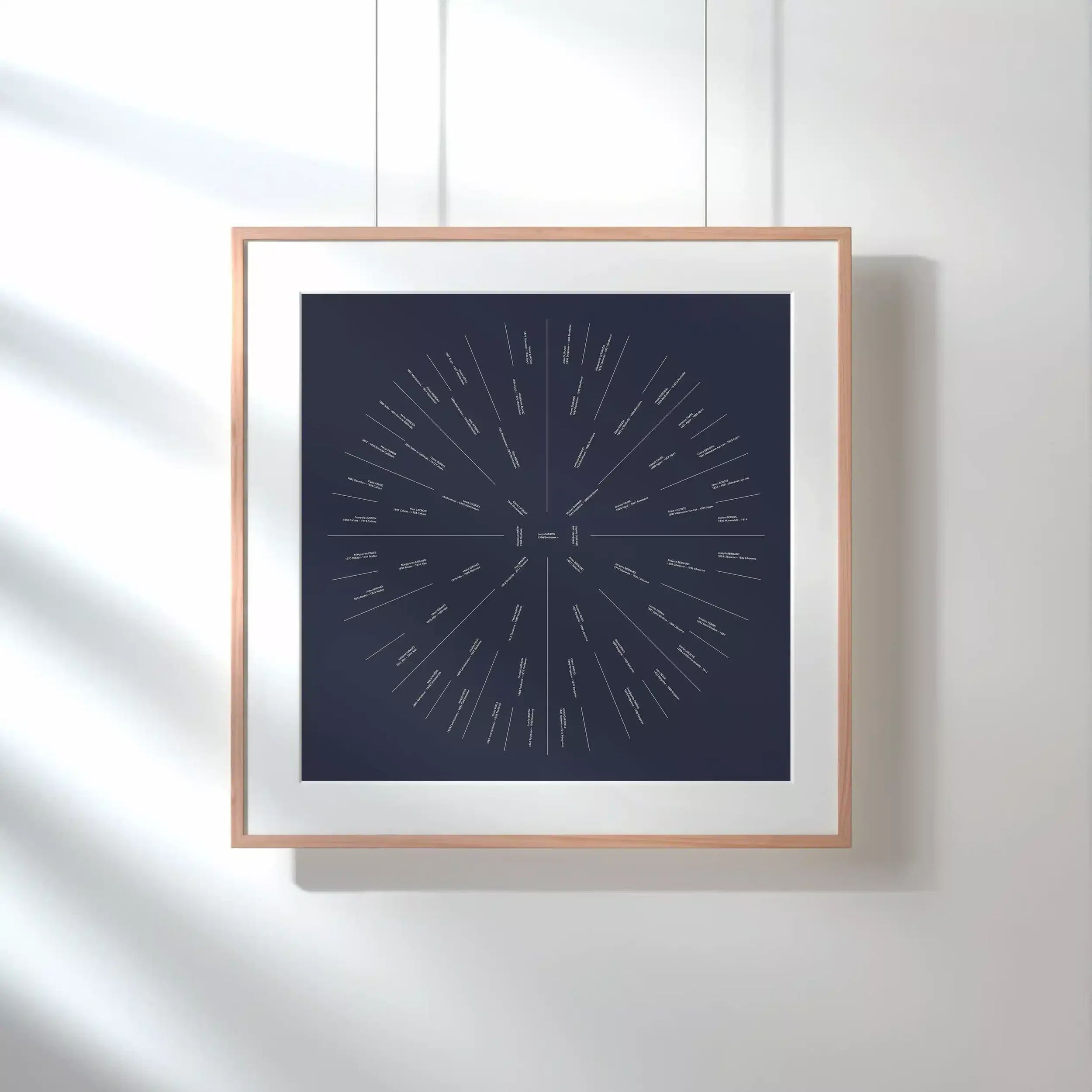 La recherche effectuée pour l’arbre généalogique établit votre ascendante sur 6, 7 ou 8 générations. À partir de vos informations de départ, quelques noms, une région, une date, nous remontons chaque branche dans les archives civiles et paroissiales françaises. Pour chaque individu identifié : prénom et nom, dates et lieux de naissance et de décès. C'est la recherche de base, celle qui structure l'arbre. Elle est incluse dans chacun de nos arbres généalogiques imprimés et livrés chez vous.