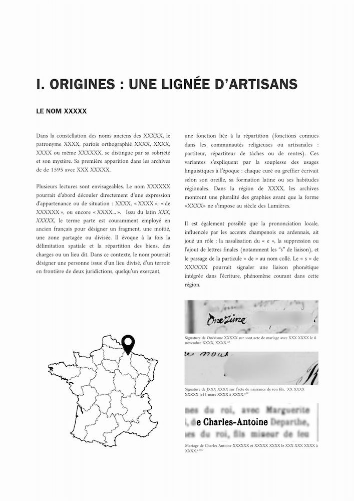 Chaque livre est entièrement personnalisé. Il est accompagné d’un index sourcé des documents retrouvés. Sa densité dépend de la richesse des sources disponibles et du périmètre défini.